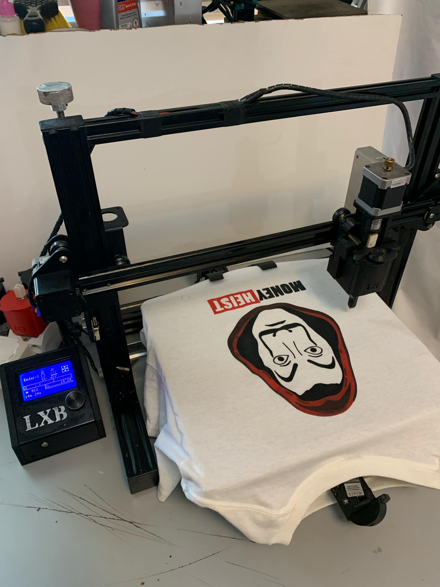 DIY LXB or LEOXBOT is a Modified Ender 3 3D printer modified to print t-shirt , cut vinyl and laser engrave.